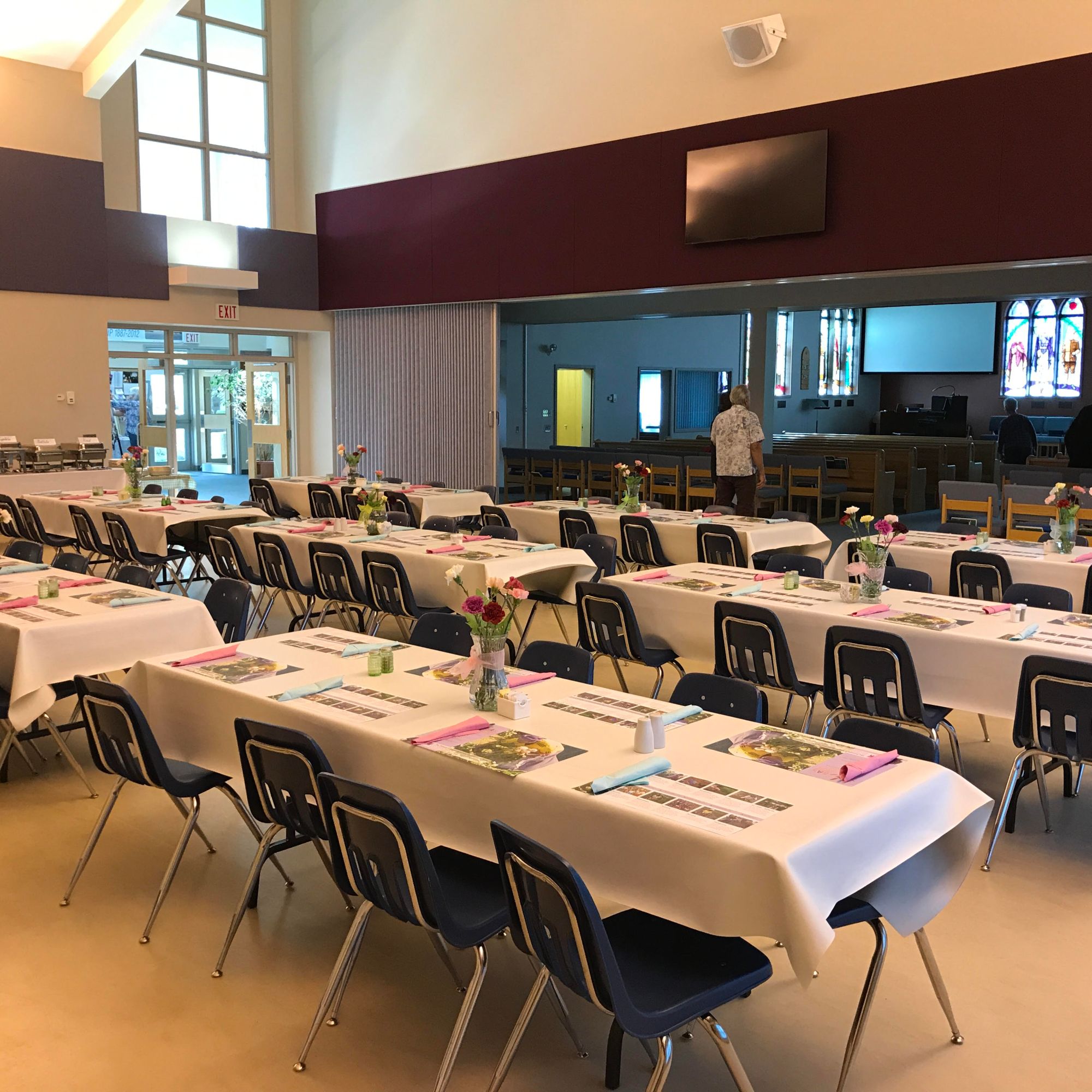 The Hall holds approximately 100 – 120 people, and can be set up to accommodate small or large groups. The rentals are available for meetings, seminars, bridal showers, baby showers, family events, etc We have meeting rooms to accommodate up to 10 people. The use of Audio Visual equipment is available with the hall rental, as well catering may be provided at an additional cost. (see Catering below)
